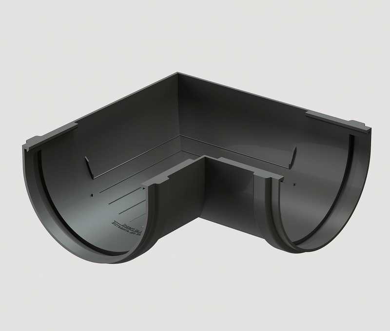 Угловые элементы устанавливаются как на внешних, так и на внутренних углах кровли и предназначены для соединения желобов.